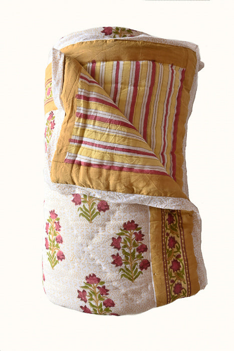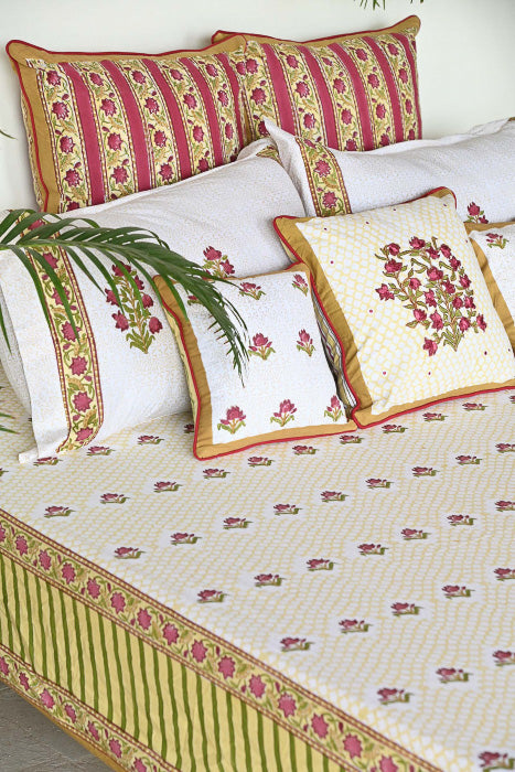 インドで見つけたブロックプリントのベッドシーツ・掛け布団(キルト)・枕カバー(2枚)の3点セットです。
