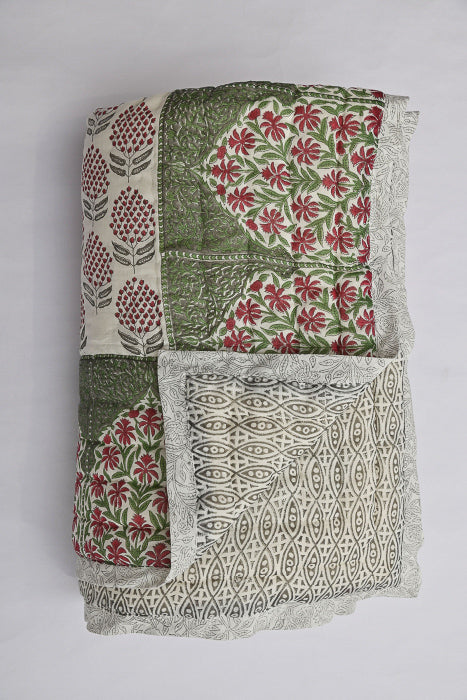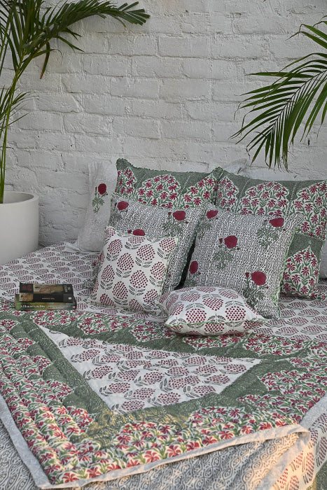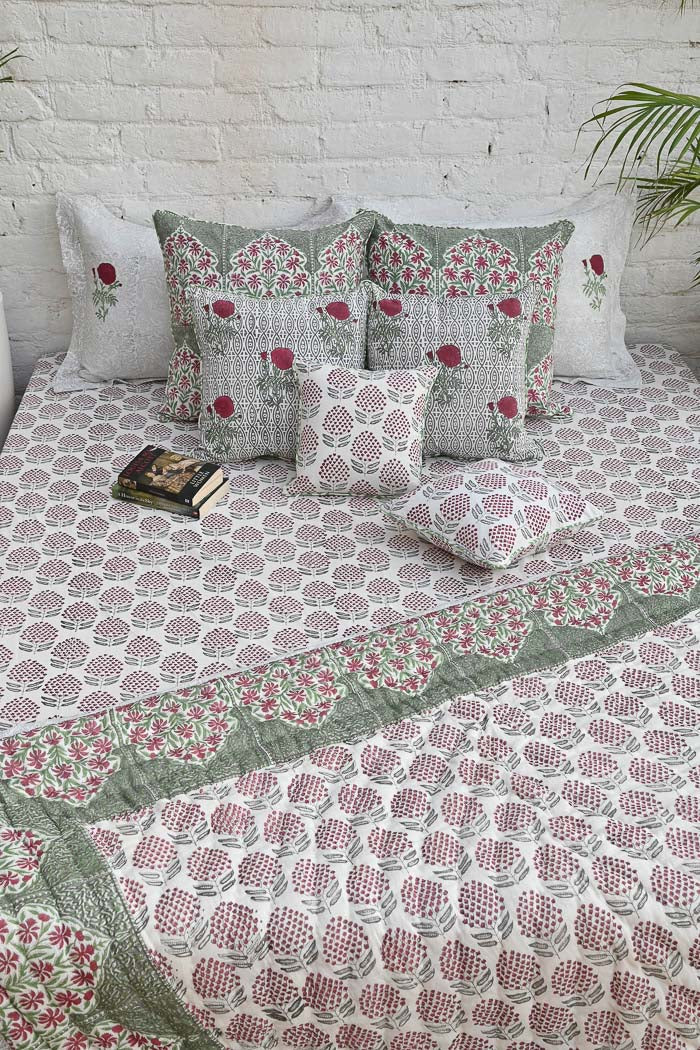 インドで見つけたブロックプリントのベッドシーツ・掛け布団(キルト)・枕カバー(2枚)の3点セットです。