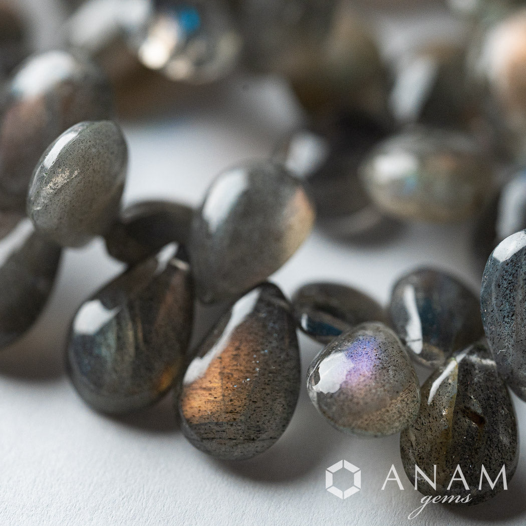 ピンクシラーラブラドライト スムースペアシェイプビーズ|淡い光がにじむ幻想的な天然石