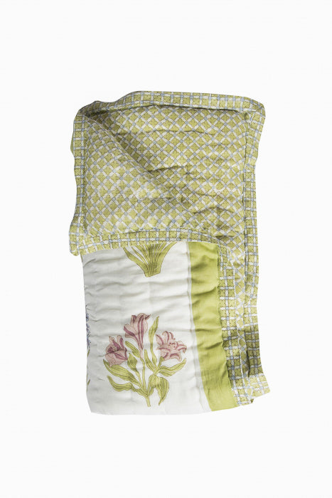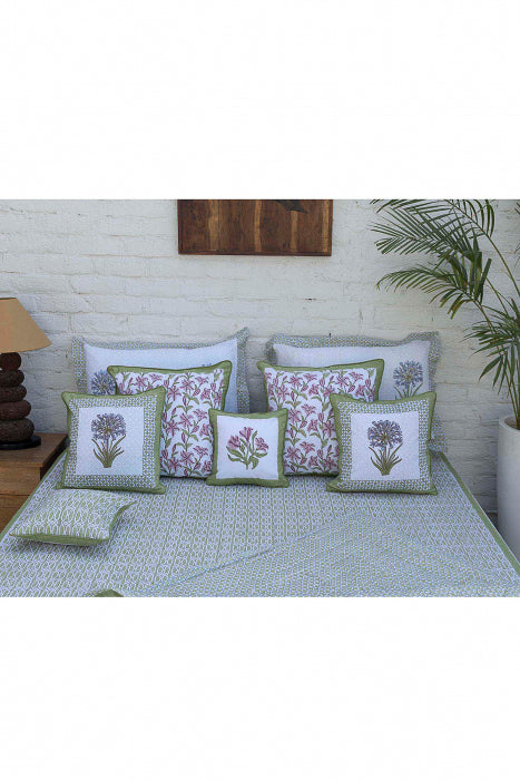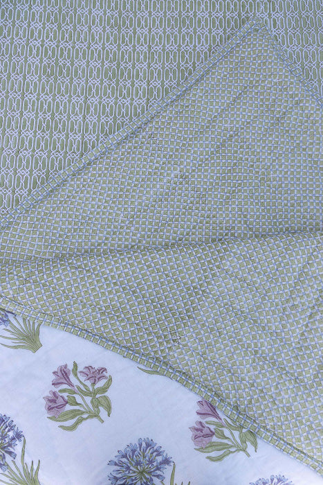 この優雅なベッドカバーでリラックスした休息をお過ごしください。 フォレスト グリーンのキャンバスにムガール帝国にインスピレーションを得た格子デザインを時代を超えたハンド ブロック プリントで仕上げたこのベッドカバーは、寝室に控えめな優雅さを加えます。