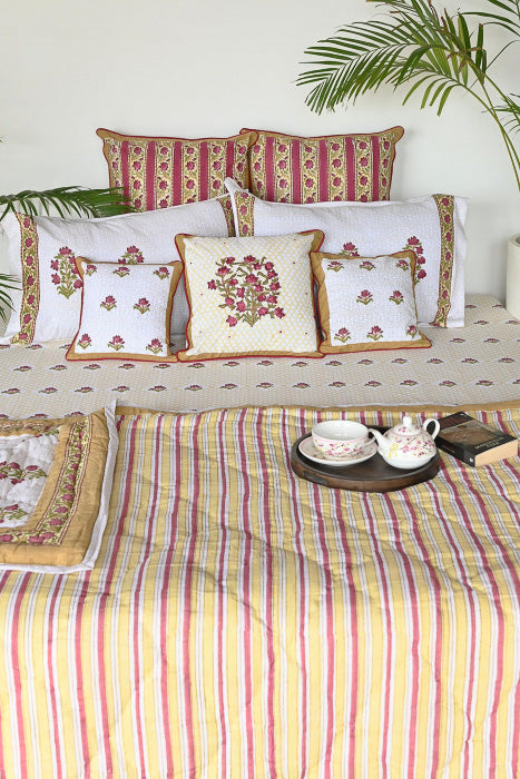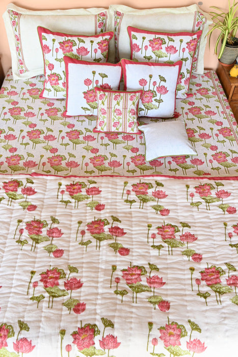 【ブロックプリント】ツタと桃色 ベッドリネン4点セット【ジャイプール伝統工芸】